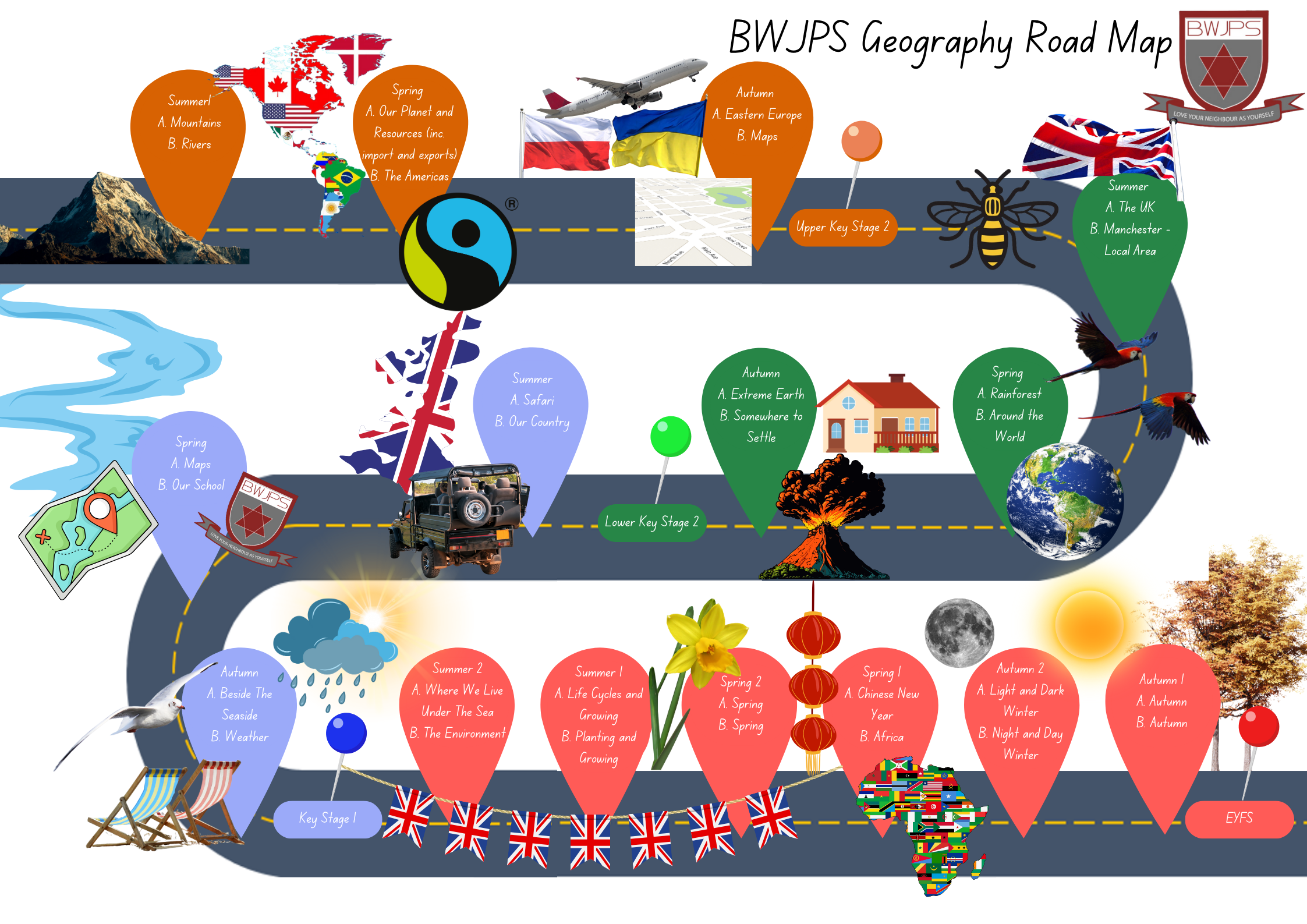 At BWJPS, we dedicate an hour a week to the teaching of geography. All skills are built on throughout the year and the school journey, with regular opportunities for retrieval built in. The children will be encouraged to use appropriate geographical language and skills and to undertake fieldwork in the locality. They will learn to follow directions, understand the characteristics of different localities and identify areas on maps and globes to develop an increasing understanding of their place in the world.
